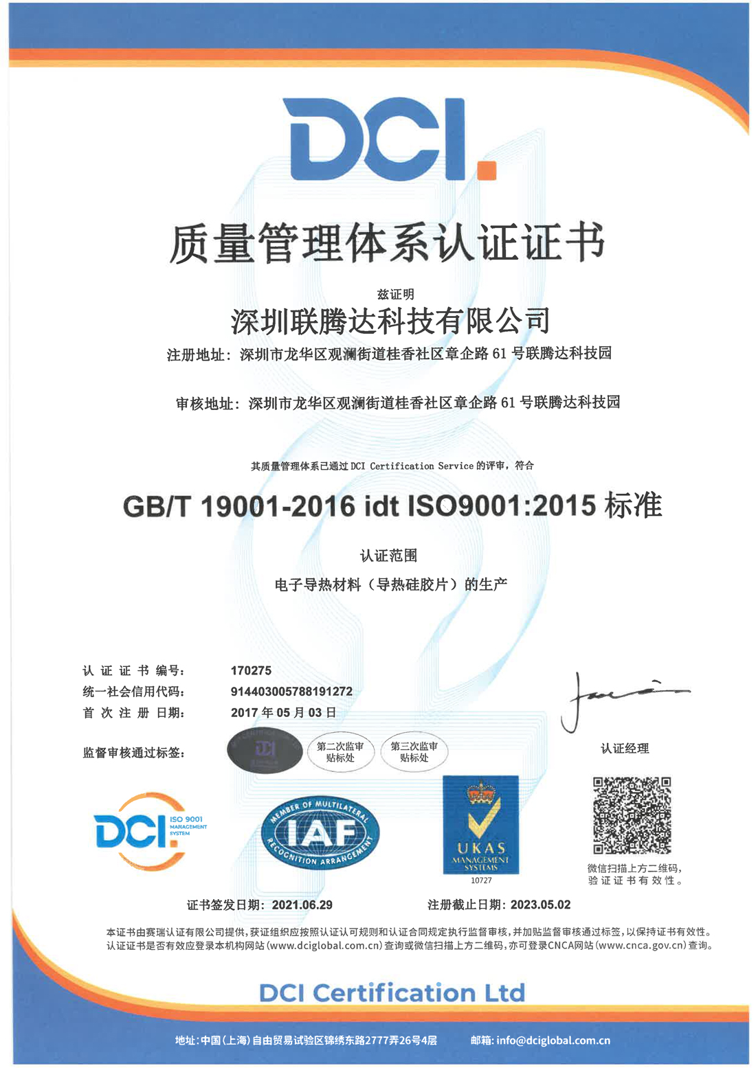 ISO9001認證(導熱材料生產) 2019-03-14(6244)次瀏覽 深圳聯騰達科技有限公司專業生產導熱硅膠片等電子器件導熱散熱材料,公司產品均為自主生產,質量可控,可為客戶提供一站式電子產品散熱導熱的解決方案,公司通過ISO9001質量管理體系認證,嚴格遵循各項指標安全生產,保證產品的質量與交期。 上一篇:導熱硅膠片ROHS報告 下一篇:UL認證 返回列表